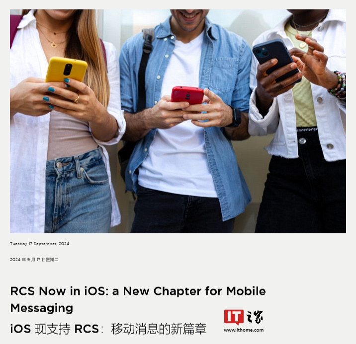 IT之家 9 月 18 日消息,全球移动通信系统协会(GSMA)昨日(9 月 17 日)发布博文,庆祝苹果 iOS 18 系统支持富通讯解决方案(RCS),并表示下一阶段是实现安卓与 iPhone 间的 RCS 加密通信。