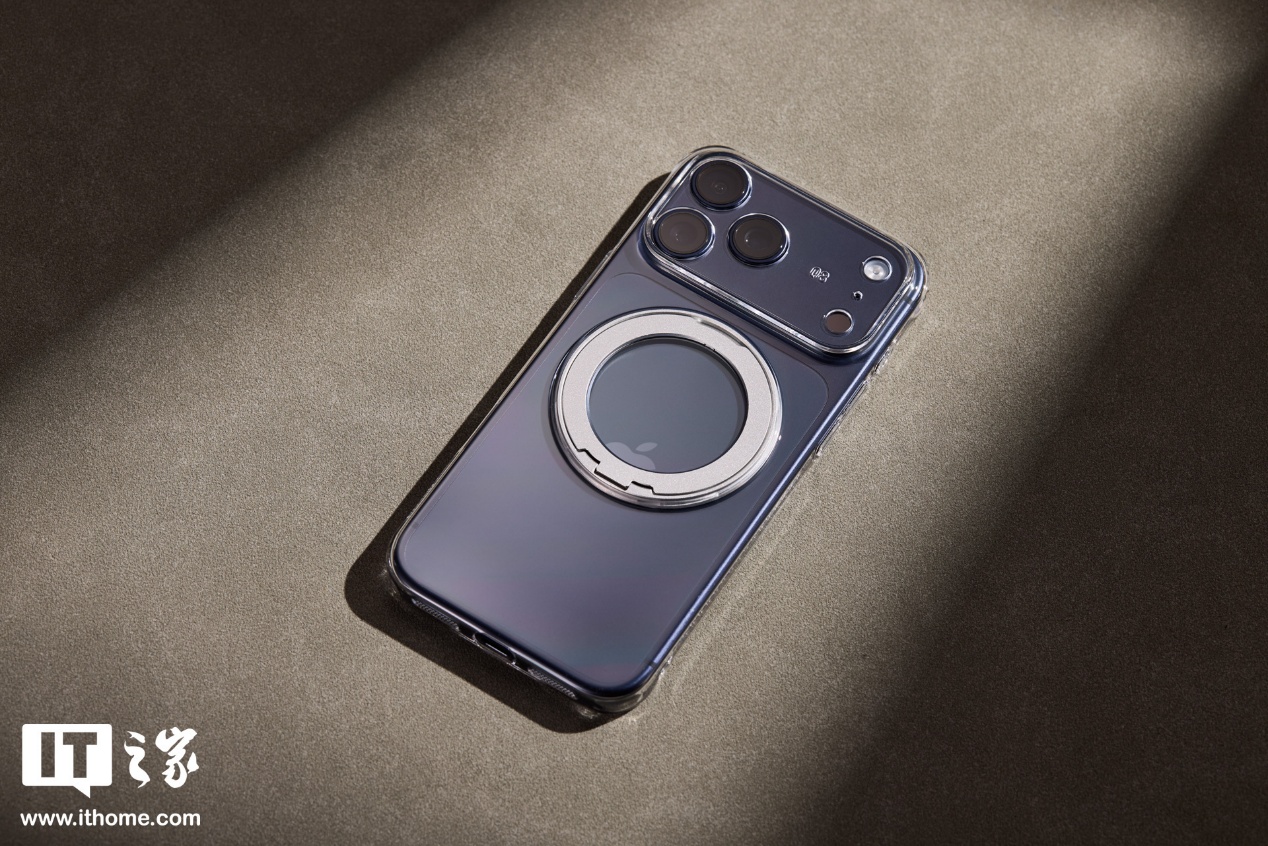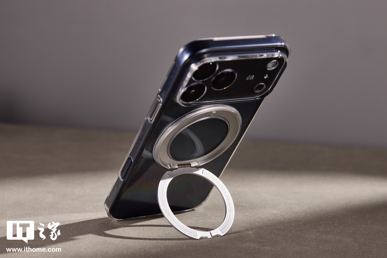 倍思零感支点壳 R1s 的磁吸支架能够 360 度旋转,内置 30 颗 N54 磁铁,折叠后可适配多种 MagSafe 磁吸配件。