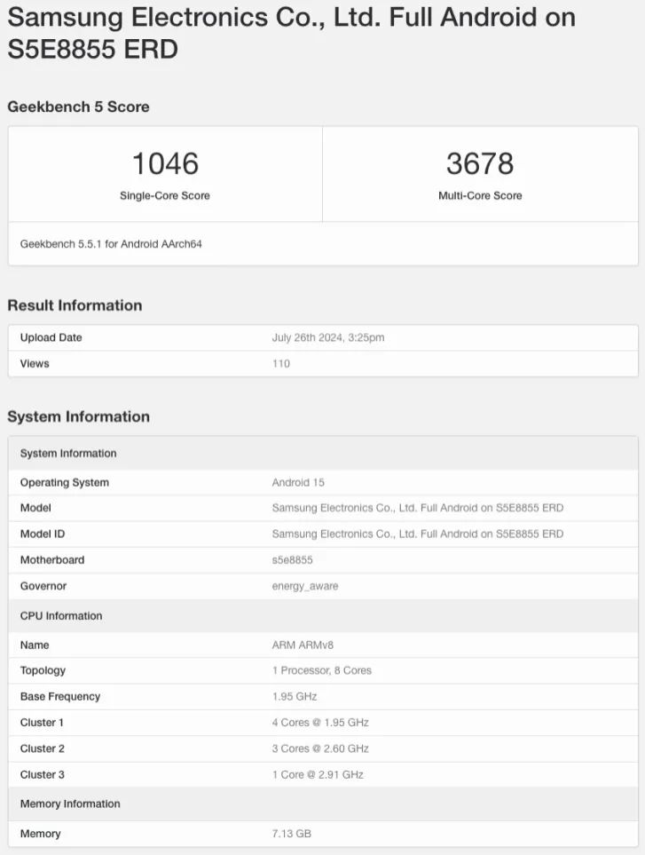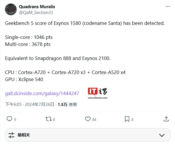 Exynos 1580 的代号为“Santa”,型号为 S5E8855,该芯片已经现身 GeekBench 跑分库,从性能数据来看和高通骁龙 888 持平。
