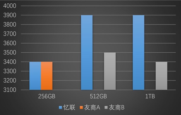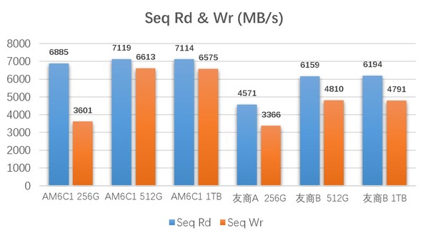 在PCMark10测试中,AM6C1 512GB、1TB容量的跑分均超过3900,比友商B的同类产品高出10%,256GB测试得分也与友商A的同类产品基本持平。