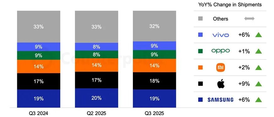 Counterpoint Research的最新数据显示,受亚太地区和中东非地区强劲需求推动,2025年第三季度全球智能手机市场出货量同比增长4%。