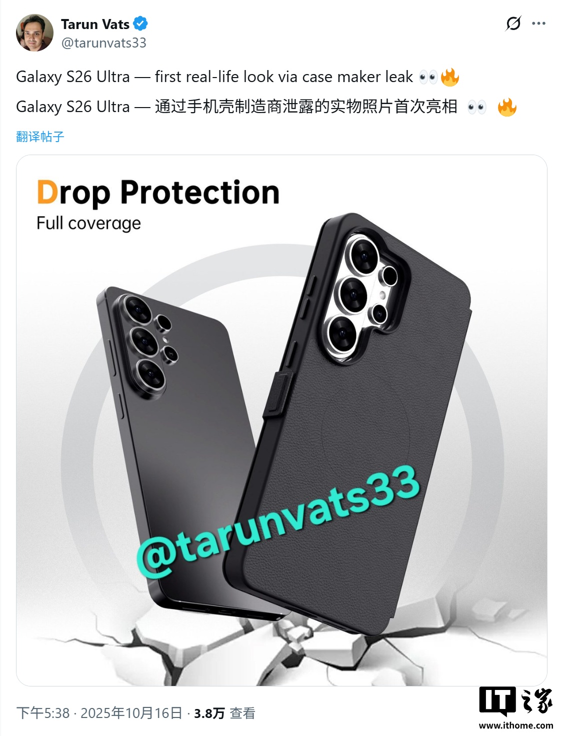 IT之家 10 月 17 日消息,消息源 @tarunvats33 昨日(10 月 16 日)在 X 平台发布推文,分享了一张来自手机壳配件厂商的图片,展示了三星 Galaxy S26 Ultra 的外观,整体设计相较前代变化不大,主要调整集中在后置摄像头模组。