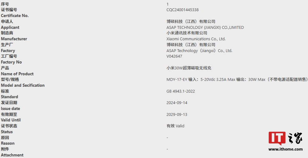 IT之家注意到,小米 30W 超薄磁吸无线充已通过国内 CQC 认证,型号为 MDY-17-EY,支持 65W 输入和最大 30W 无线输出。