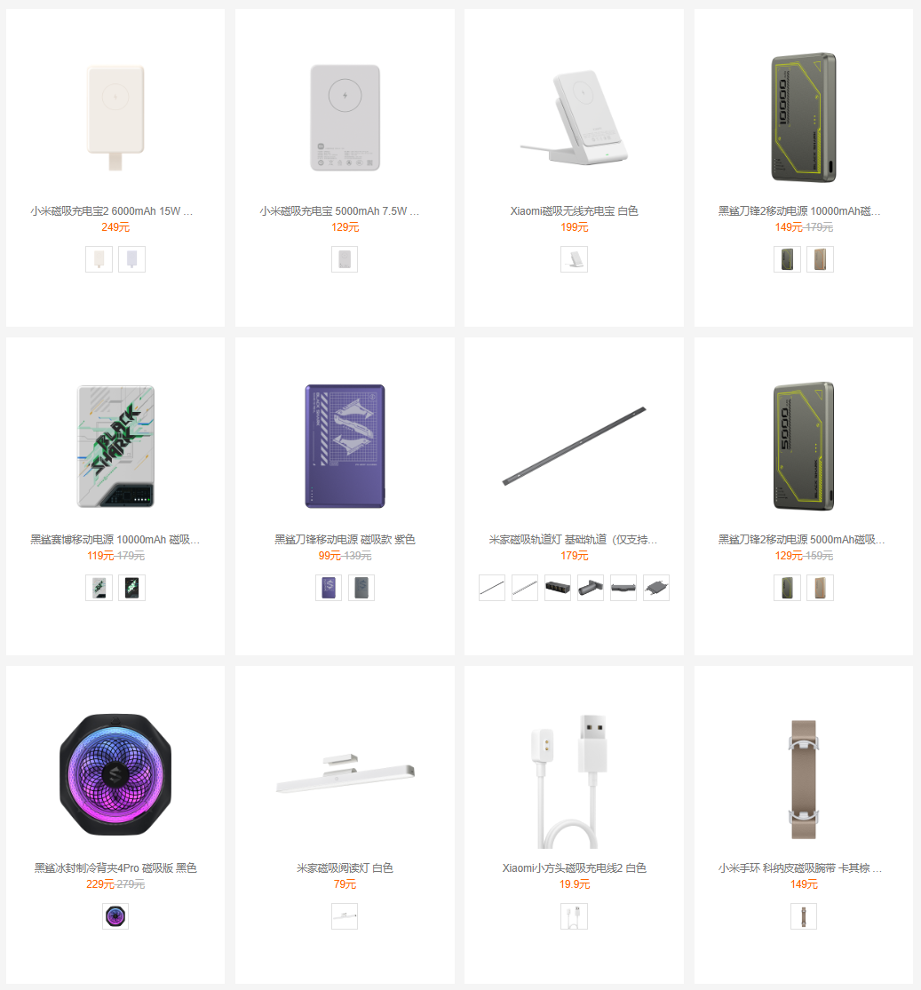 目前小米官方在售有三款本品牌磁吸充电宝,覆盖三种设计款式:自带支架挂孔款、普通磁吸款和立式分离设计款,售价分别为 249 元、129 元和 199 元。