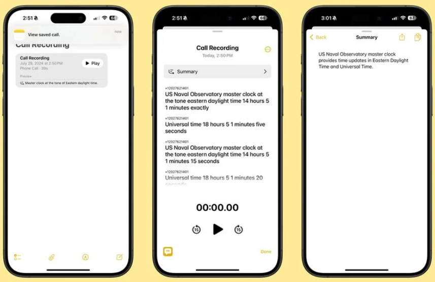 iOS 18 的通话录音功能此前仅支持拥有“Apple Intelligence”的 iPhone 15 Pro / Max,该功能被描述为“只需在 Notes 或 Phone 应用中点击‘录音’即可捕获录音和文字记录”。