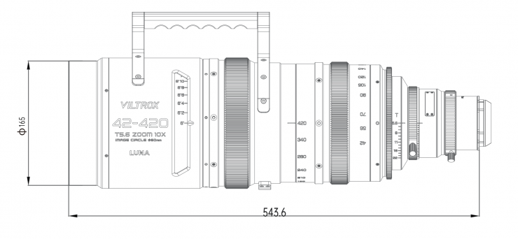 参数方面,这款 LUNA 42-420mm T5.6 镜头具有 60mm 的超大成像圈,恒定 T5.6 光圈,支持 10 倍变焦,搭配 44×33 中画幅相机无压力,包括 ARRI ALEXA 65、FUJIFILM GFX100 系列等产品,且适用于即将推出的 Blackmagic URSA Cine 17K(分辨率 19520×8040)。