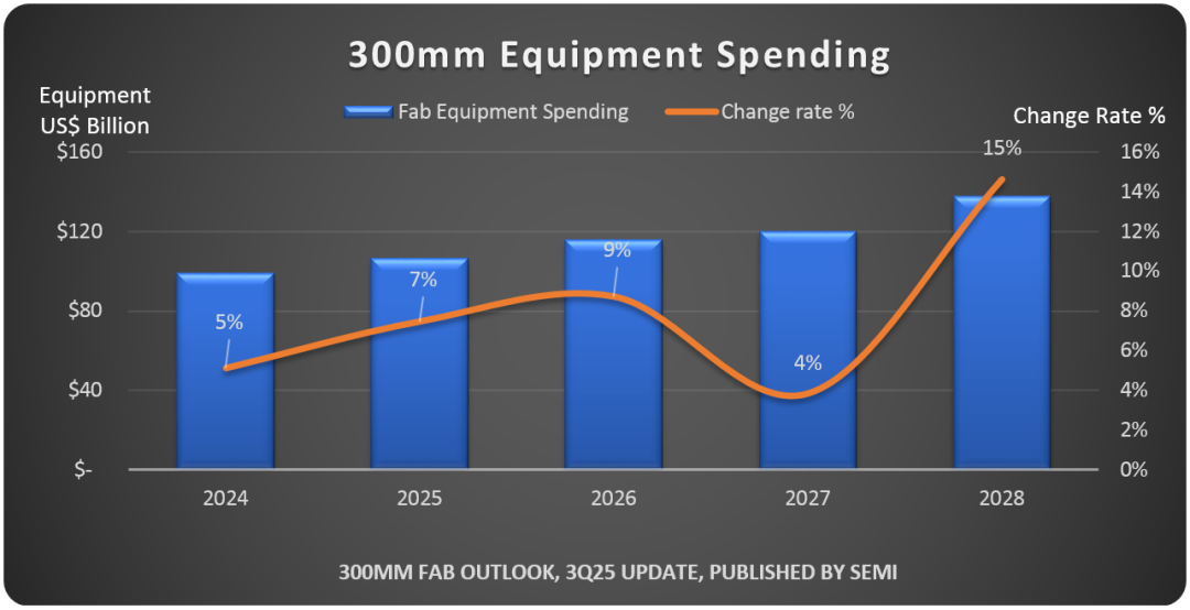 SEMI报告预测,2026年投资将增长9%,达到1160亿美元;2027年增长4%,达到1200亿美元;2028年将增长15%,达到1380亿美元。