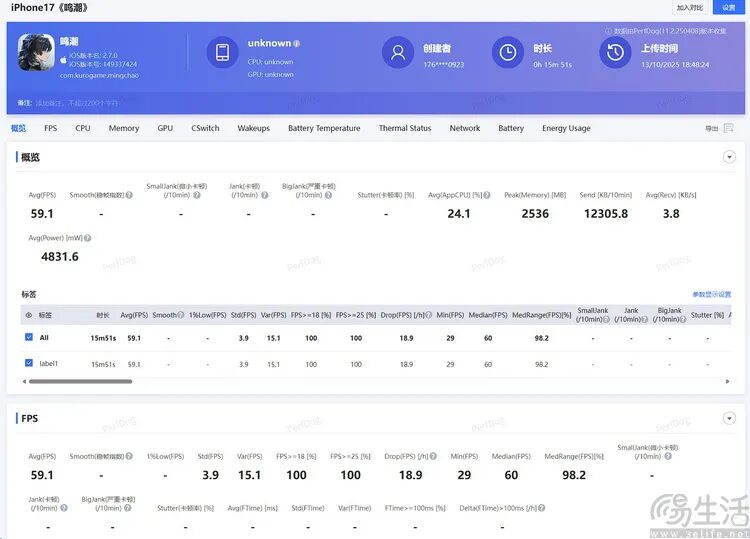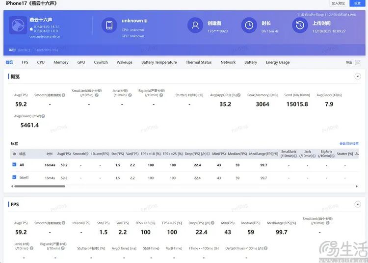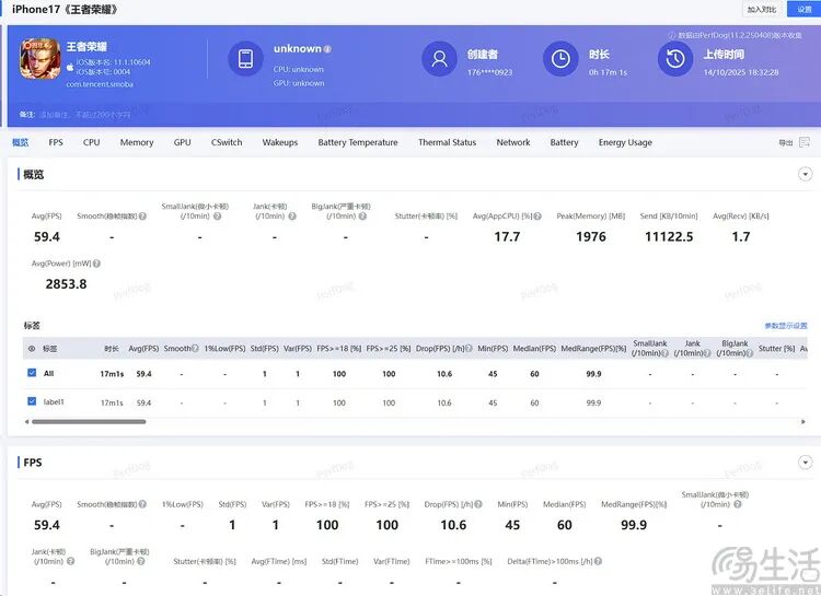 依旧还是先从轻负载的《王者荣耀》看起,到我们测试结束的10月中旬为止,目前版本的《王者荣耀》高帧率模式尚未适配iPhone 17标准版。在此基础上,59.4FPS平均帧、2853mW平均功耗的成绩,客观上确实不能算是如今特别亮眼的能效表现。