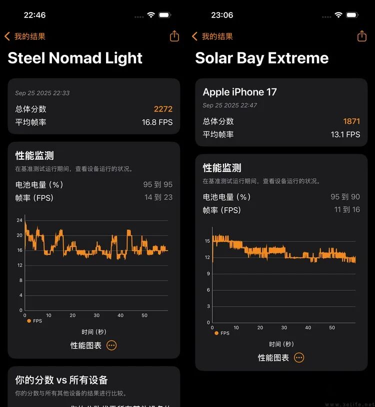 换成iPhone 17 Pro Max呢?很显然,在多了一组GPU核心、内存和缓存都更大的前提下,iPhone 17 Pro Max的图形性能就要比iPhone 17高出不少。事实上,它的常温环境跑分成绩就已经胜过iPhone 17的低温环境成绩。