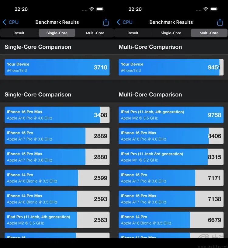那么A19 Pro的情况又是怎样的呢?正如我们在前面已经提及的那样,它的CPU架构与A19相同,但拥有更大的缓存、更快的内存,以及明显更高的散热配置。于是在同样的测试项目中,我们手头这台iPhone 17 Pro Max所配备的A19 Pro,就是要比A19单核快了5.5%,多核更是领先6.8%。