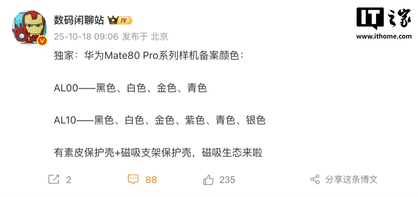 该博主还在上周末爆料了华为 Mate 80 Pro 系列样机备案颜色:AL00 系列包含黑、白、金、青四种配色,AL10 系列则是黑、白、金、紫、青、银六种配色。此外,该机型还提供素皮保护壳 + 磁吸支架保护壳,将支持磁吸生态。
