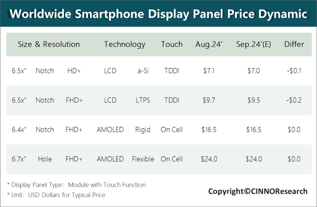 CINNO Research 预测,9 月和 10 月 a-Si 价格触底后将维持在低位不再降价,LTPS 面板价格将持续下行;刚性 / 柔性 AMOLED 面板价格短期内趋于稳定。