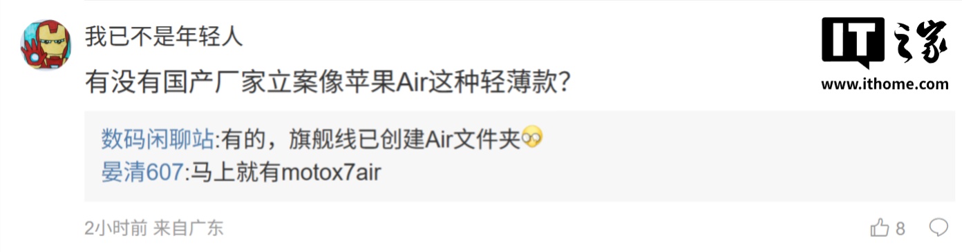 ”;另一名用户则询问道:“有没有国产厂家立案像苹果 Air 这种轻薄款?”,博主则表示:“有的,旗舰线已创建 Air 文件夹”。
