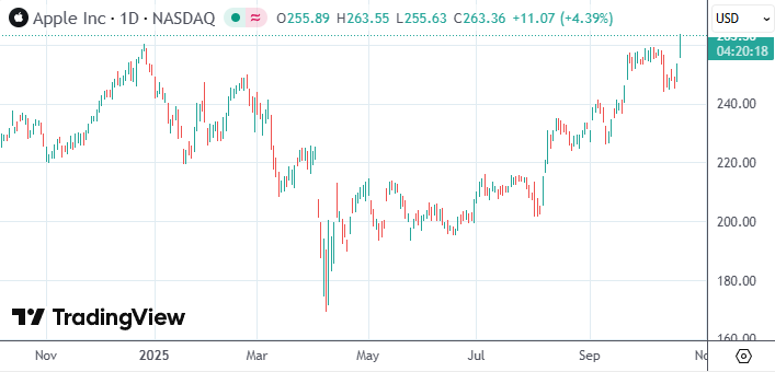 财联社10月20日讯(编辑 赵昊)周一(10月20日)美股盘中,苹果公司股价涨超4%,最高报每股263.59美元,刷新历史新高,公司总市值也突破3.9万亿美元关口。