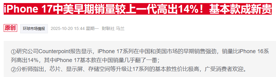 日内财联社报道也提到,研究机构Counterpoint Research的最新报告显示,iPhone 17在中国和美国两大市场上市后的10天内,销量比iPhone 16系列高出14%。