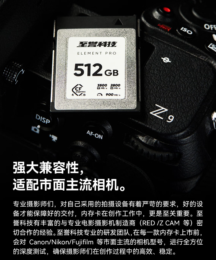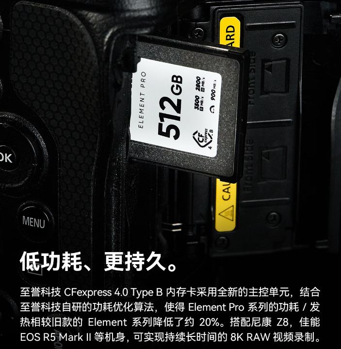 Element Pro 存储卡采用低功耗设计并对散热进行优化,适配市面主流相机。同时该存储卡支持 12K RAW 视频录制、EOS R5 II / R 全格式录制。