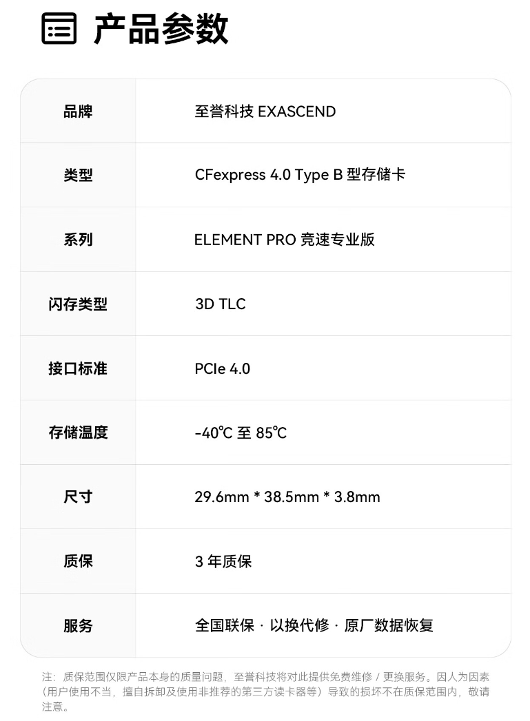 IT之家附至誉 Element Pro CFexpress 4.0 Type B 存储卡各存储版本性能及产品参数如下: