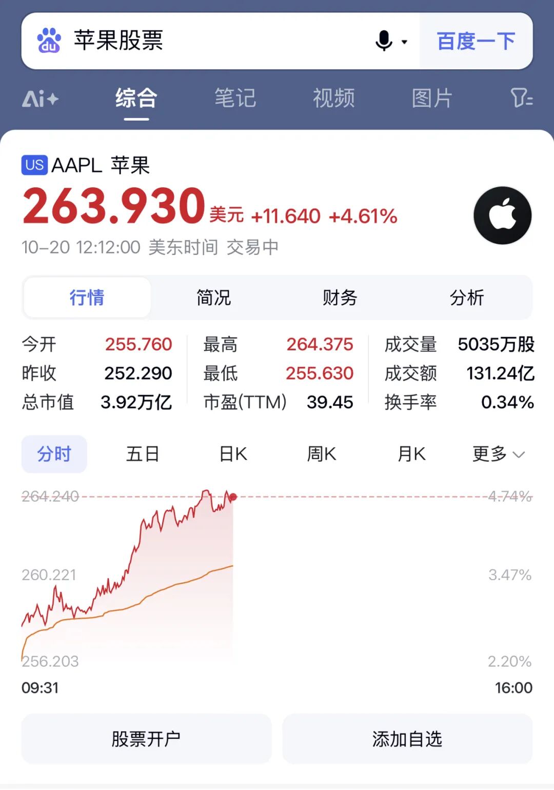 受益于iPhone 17系列全球热销,今日美股苹果股价创历史新高,报263.93美元,涨幅一度超4.5%,总市值超3.9亿美元,一度达3.92万亿美元。