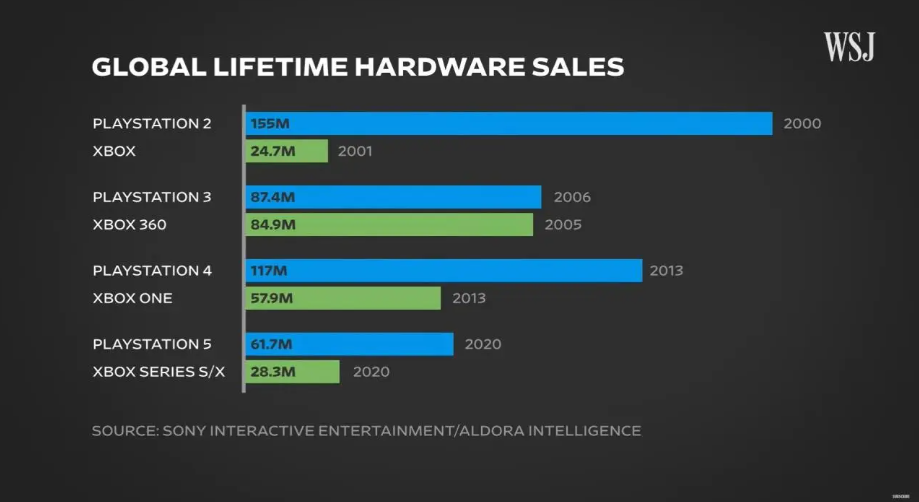 《华尔街日报》援引 Aldora Intelligence 的数据,对索尼和微软从 PS2 和初代 Xbox 时代以来的硬件销量进行了比较。在 PS2 和初代 Xbox 世代,索尼以 1.55 亿台的销量绝对碾压竞争对手,而 Xbox 的销量仅为 2470 万台。