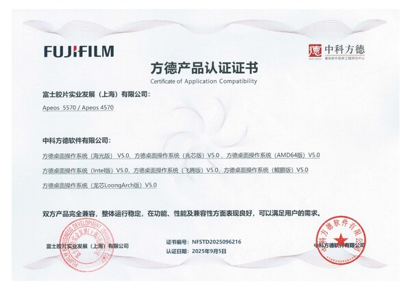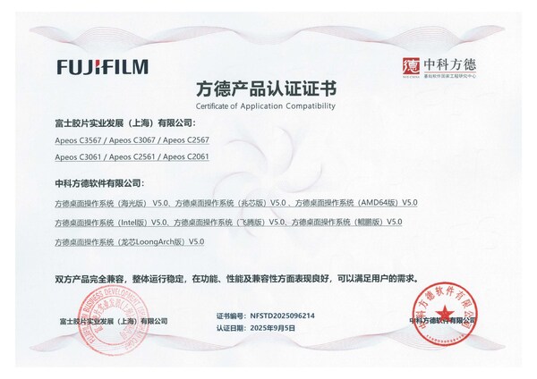 北京2025年10月21日 /美通社/ -- 近日,富士胶片商业创新Apeos系列A3数码多功能机获得中科方德产品认证证书,其中包括旗舰智能型A3彩色数码多功能机Apeos C3567/C3067/C2567、Apeos C3061/ C2561/C2061、Apeos C7071/C6571/C5571/C4571/C3571/C3071,和A3数码多功能机Apeos 5570/4570共14个机型,该系列产品已获中标麒麟、龙芯、兆芯、统信UOS兼容认证。这是继与华为合作共推鸿蒙系统普及,富士胶片商业创新(中国)全面支持IT国产化,积极推进全线产品与中国国产操作系统和中国芯产品兼容互认的又一举措。