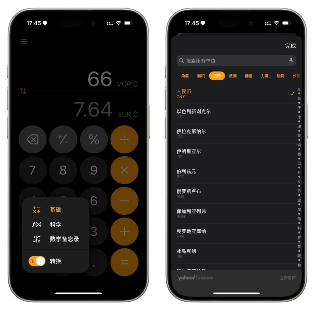 iPadOS 18 上所介绍的计算器更新,也一并来到了 iOS 和 macOS 上。不过 Apple 没有提到的是,新的计算器还支持了单位换算功能,涵盖了角度、面积、货币、能量等诸多单位,又成功地干掉了一些第三方计算器 App。