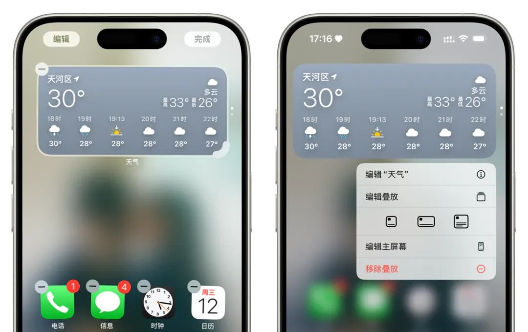 iOS 18 还支持直接在桌面改变小组件的大小,并支持把图标转化为小组件。但需要注意的是,调整小组件时桌面整体的布局容易发生一些「意想不到」的大改变,需要谨慎操作。