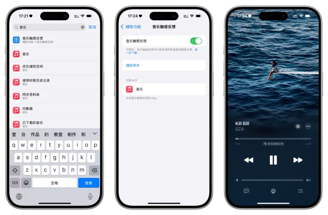 不过,不是所有的歌曲都支持触感反馈,也无法通过音量进行调节震动大小,即便在静音状态下震动反馈也不会停止。不过与功能类似的索尼动态震动相比,iPhone 的音乐震感不仅更丰富也更柔和,不会像索大法那样震得手麻。