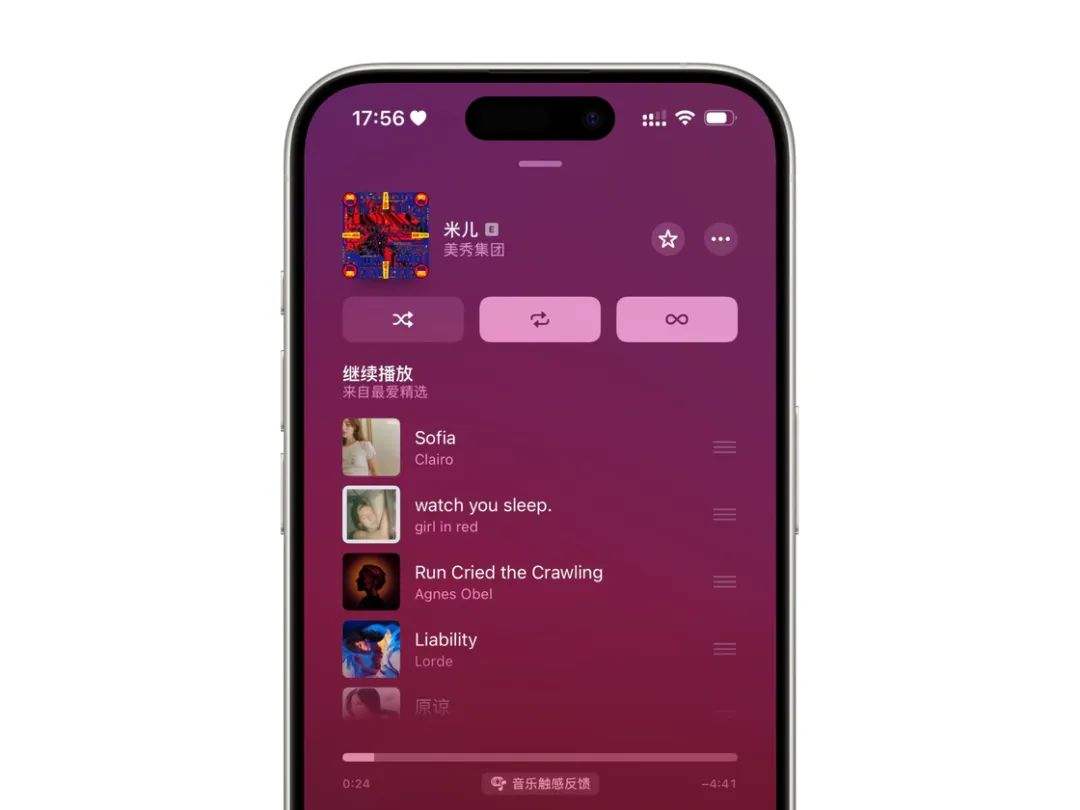 开启后,iPhone 将会随着音乐的旋律和节奏发出震动。此外,在歌曲的正在播放页面中,原来显示音频质量和杜比全景声 logo 的区域会被替换为「音乐触感反馈」,点击即可开启或关闭。