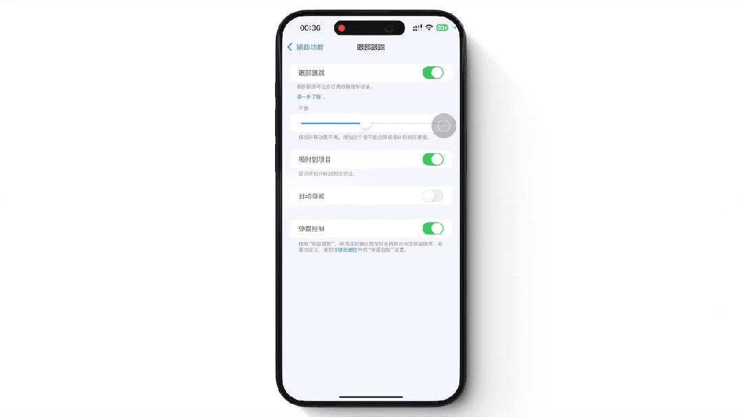 iOS 18 中辅助功能还增加了另一些听起来就很科幻的更新:眼动追踪,应该是 Vision Pro 功能下放,实测比较依赖光线。跟踪时有四个采集点,仅通过视线的移动和停留来进行手势操作,手头不方便但又要用手机的话,这个功能也许就是最好的解决方案。