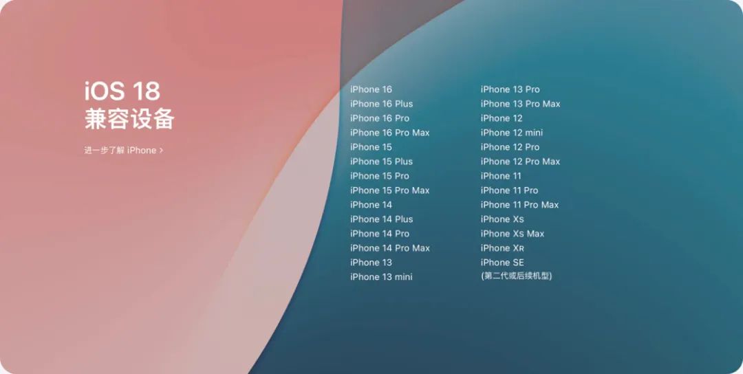 如果你想知道自己的设备是否能够升级新版系统,可以在iOS 18 官网 查看。据 Apple 官网提供的信息,iOS 18 支持 iPhone Xs/Xs Max (2018 年) 以及之后推出的产品: