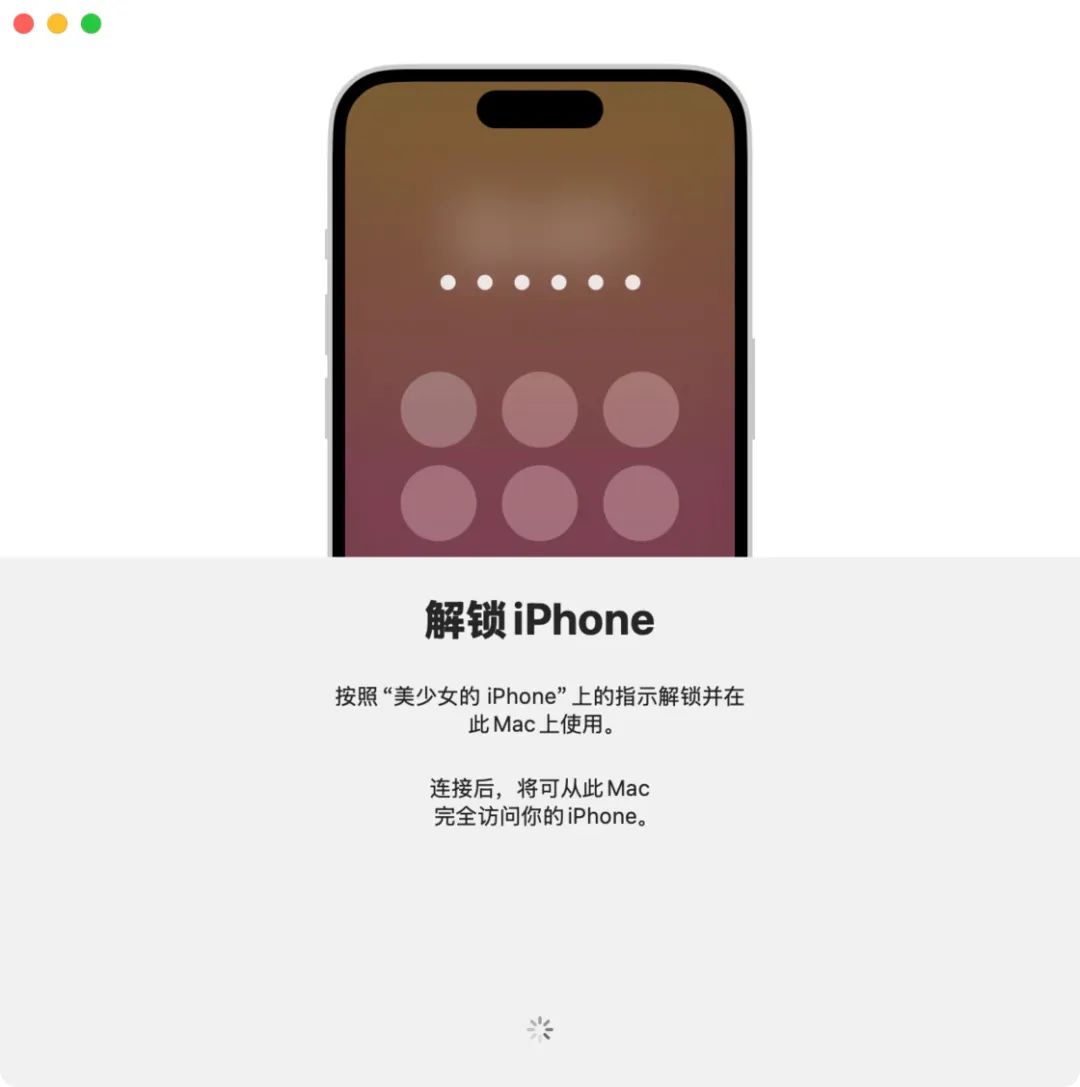 第一次使用时,iPhone 镜像会要求你输入 iPhone 解锁密码。确认后就会出现使用许可。一个 Apple ID 有多部 iPhone 时,用户可以选择特定的设备连接,后续还可以选择其他 iPhone 连接。