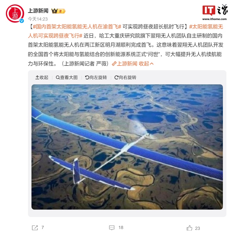 IT之家 9 月 18 日消息,综合《科技日报》、重庆上游新闻今日报道,哈工大重庆研究院旗下翌翔无人机团队自主研制的国内首架太阳能氢能无人机在重庆两江协同创新区明月湖顺利完成首飞,意味着翌翔无人机团队开发的全国首个将太阳能与氢能结合的创新能源系统正式“问世”,可大幅提升无人机续航能力与环保性。
