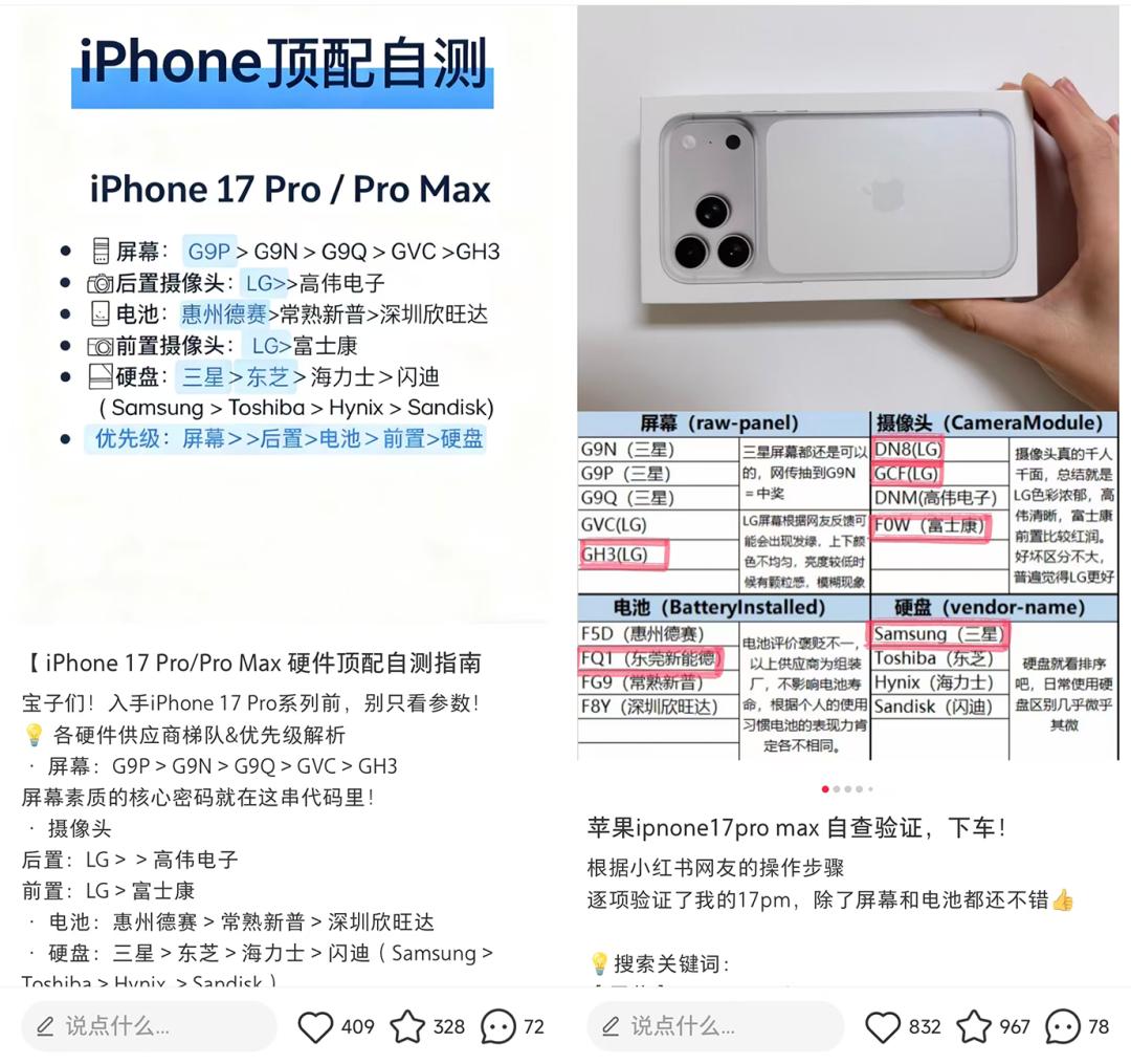 现在在小红书、B 站上还能轻松找到一大堆罗列 LG 屏幕面板的“罪状”,甚至还有一些账号搞了个“一等奖苹果手机对照表”,写明哪些手机零配件的供应商是最好的,哪些是差的,全部用上最好零部件供应商的苹果手机才是“一等奖手机”,放大用户的焦虑。
