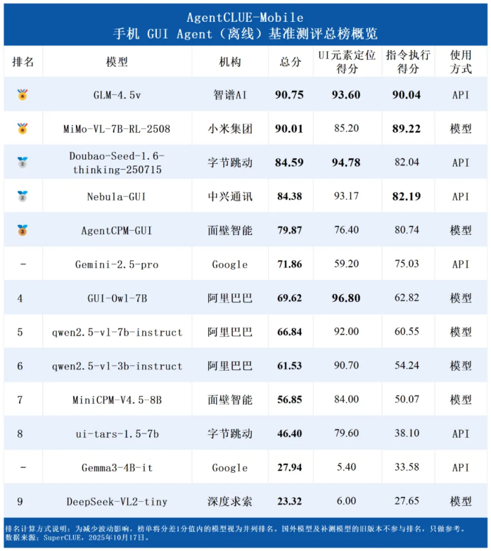 2025 年 10 月 17 日,SuperCLUE 正式发布首期 AgentCLUE-Mobile 手机 GUI Agent(离线)测评报告。该报告填补了行业统一测评标准空白,围绕中文用户日常使用场景展开,对 13 个国内外代表性智能体产品进行全面评估。其中,中兴通讯旗下 Nebula-GUI 表现亮眼,以总分 84.38 分斩获银牌,在 UI 元素定位与指令执行两大核心能力上展现出强劲竞争力,成为本次测评中极具代表性的国产终端智能模型之一。
