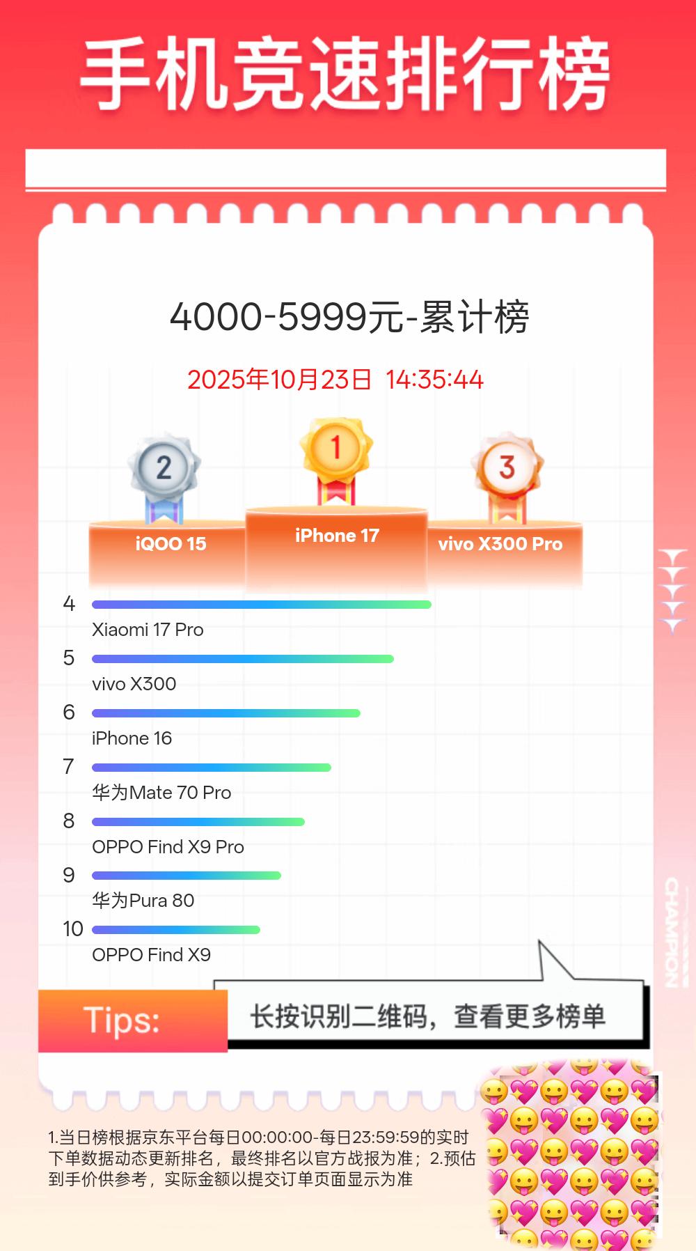 当然,在官方统计数据出炉前,笔者也找到了电商平台的累计榜单,权当给看客做个参考,根据京东《手机竞速排行榜》最新显示,截至2025年10月23日 14:35,在4000-5999元价格区间的智能手机销量累计榜前十排名如下: