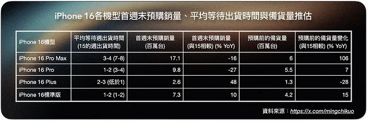 郭明錤预测苹果 iPhone 16 系列首周销量为 3700 万台,相比较 iPhone 15 系列销量同比减少 12.7%,其中一个重要原因是 iPhone 16 Pro 系列的销量低于预期。