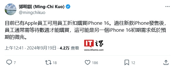 IT之家 9 月 19 日消息,天风国际证券分析师郭明錤今天(9 月 19 日)在 X 平台发布推文,表示目前已经有苹果公司员工,通过员工折扣价格,购买苹果 iPhone 16 系列。