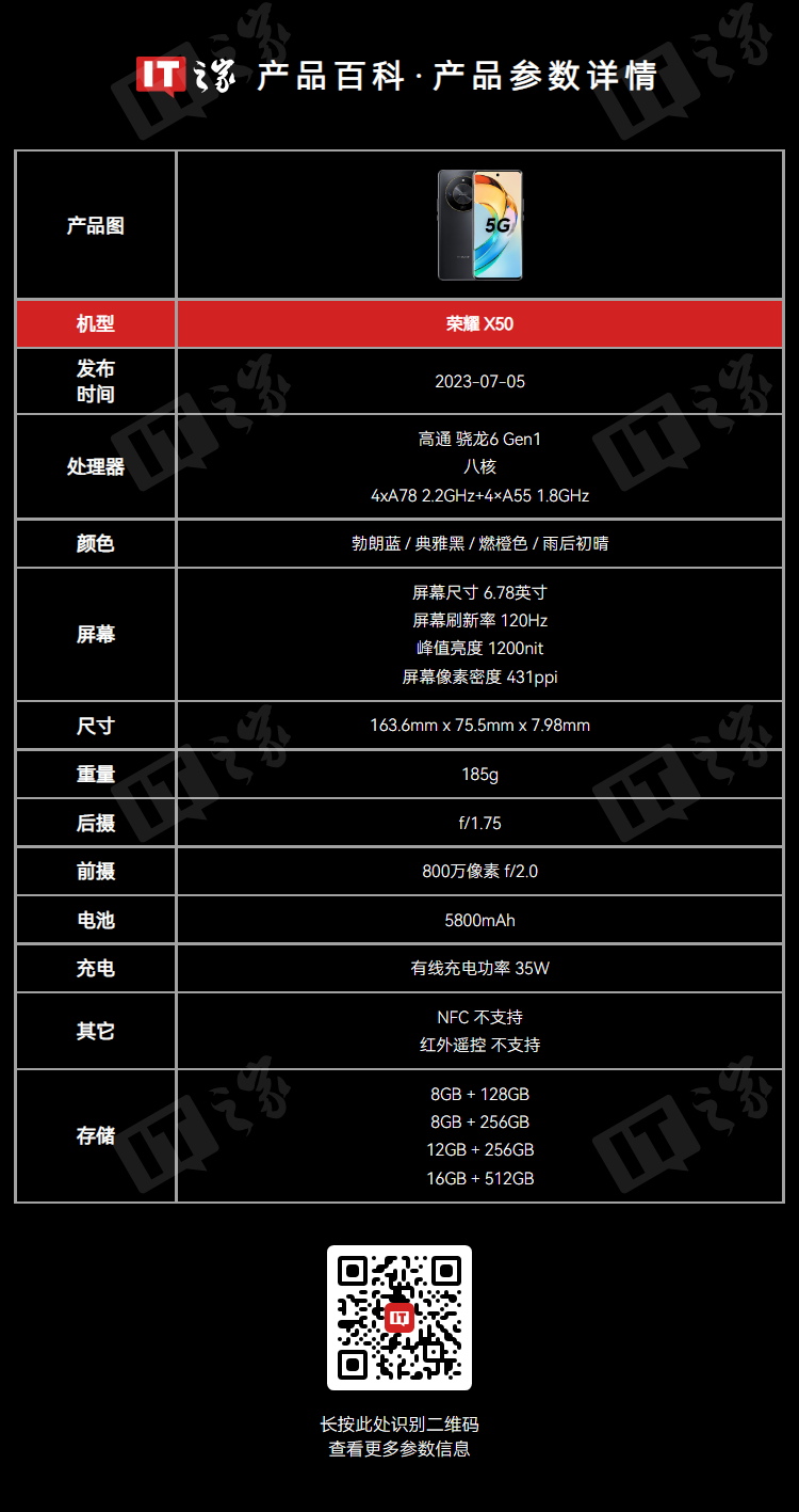 作为参考,荣耀 X 系列上一代手机 X50 定位中端,搭载骁龙 6 Gen 1 处理器,提供燃橙色、勃朗蓝、典雅黑、雨后初晴 4 款配色,后置圆环形摄像头模组,配备 6.78 英寸高频 PWM 调光技术 1.5K 曲屏,支持 10.7 亿色彩显示、1200nit 峰值亮度、120Hz 高刷。