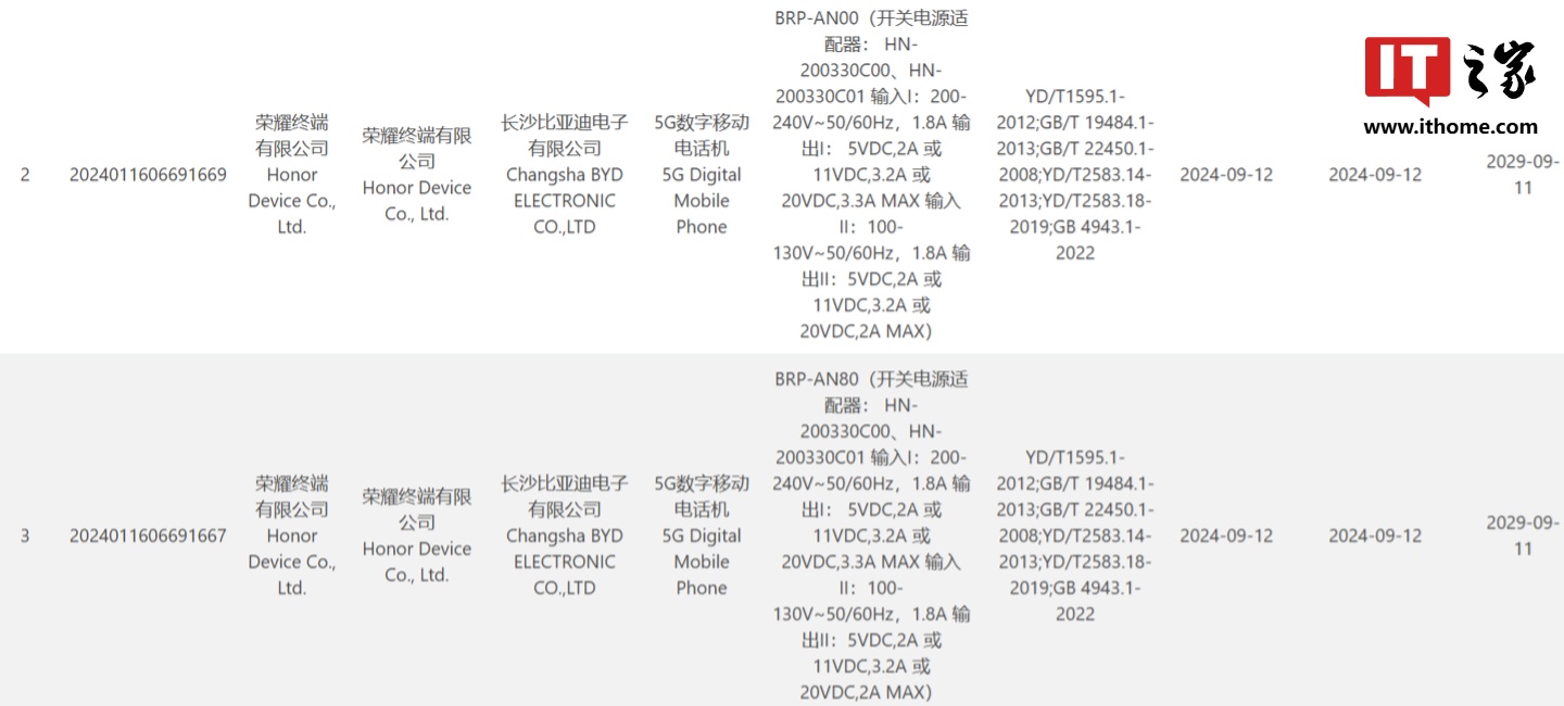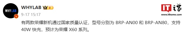 IT之家 9 月 19 日消息,两款型号分别为 BRP-AN00、BRP-AN80 的新机于 9 月 12 日通过 3C 认证,支持 40W 快充,博主 @WHYLAB 称预计为荣耀 X60 系列。