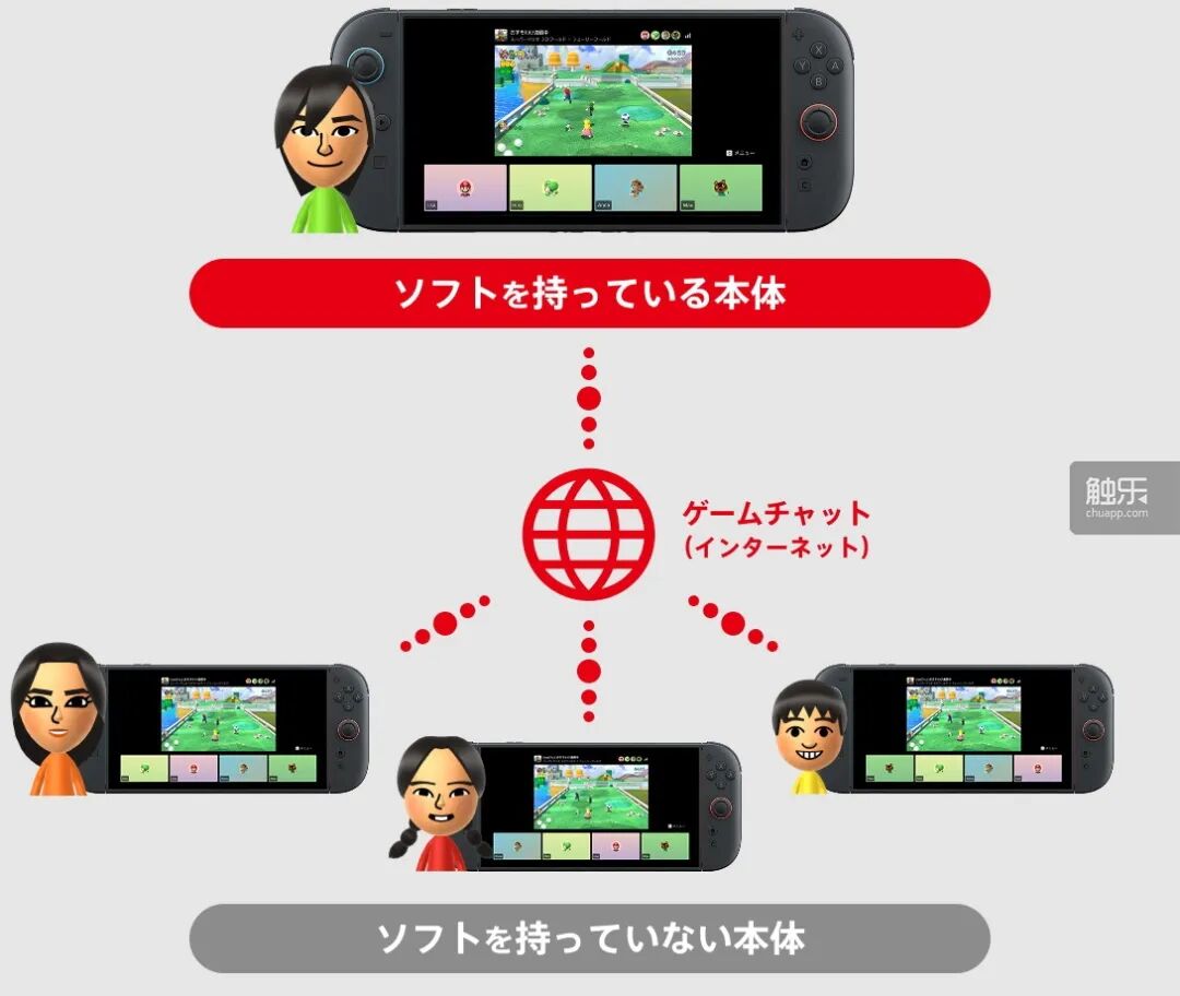 GBA和NDS支持“1卡4人玩”功能,1张卡带可以将部分游戏数据传输给其他3名玩家。Switch最初也打算加入这一功能,然而Switch卡带的容量远大于NDS,玩家无法接受几十分钟的传输时间。Switch 2凭借更强的性能,可以在玩游戏的同时发送无线视频信号,将画面即时串流给其他3名玩家,无需等待,Wii U的串流技术在Switch 2上得到了进化。