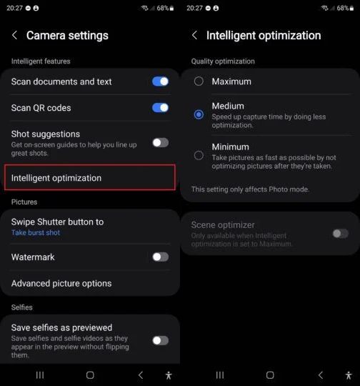 具体操作是,打开相机应用并进入其设置,点击智能优化,然后选择中等。