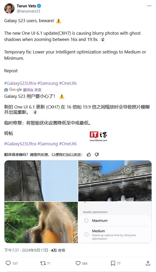 IT之家 9 月 19 日消息,三星 Galaxy S23 Ultra 用户反馈,在升级到 One UI 6.1.1 更新之后,在 16x 到 19.9x 之间变焦时,照片出现模糊及鬼影现象。这一问题随即在社交媒体平台上引发用户广泛讨论。