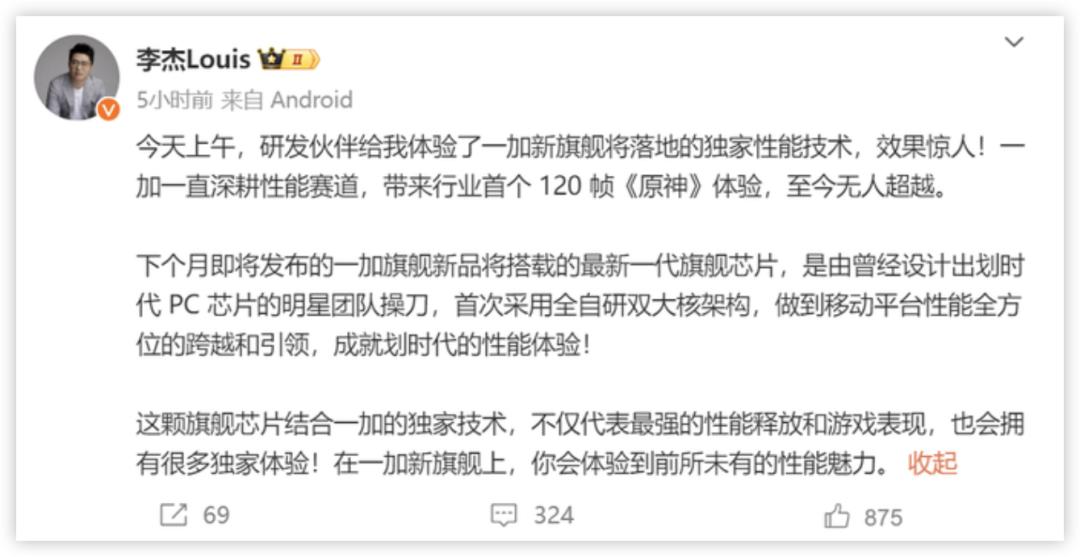 比如这次一加中国区总裁李杰就在对新机预热:旗舰芯片结合一加的独家技术,不仅代表最强的性能释放和游戏表现,也会拥有很多独家体验!在一加新旗舰上,你会体验到前所未有的性能魅力。
