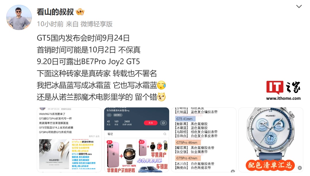 IT之家 9 月 19 日消息,博主 @看山的叔叔 昨日发文爆料,华为 WATCH GT5 手表将于 9 月 24 日在国内发布,9 月 20 日(明日)可露出华为路由 BE7 Pro、Sound Joy 2、GT5 等新品。