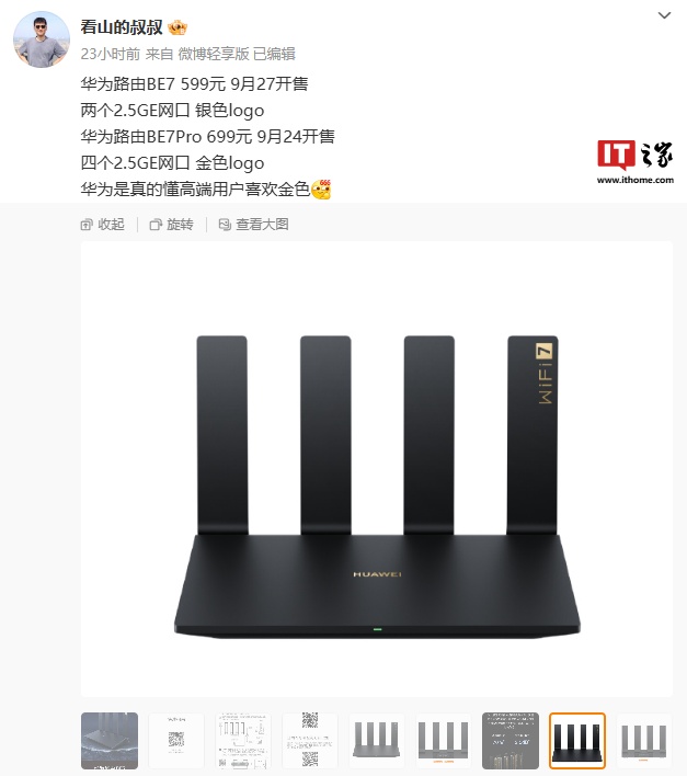 此外,华为路由 BE7 Pro 将于 9 月 24 日开售,配备 4 个 2.5GE 网口、使用金色 Logo,售价 699 元。