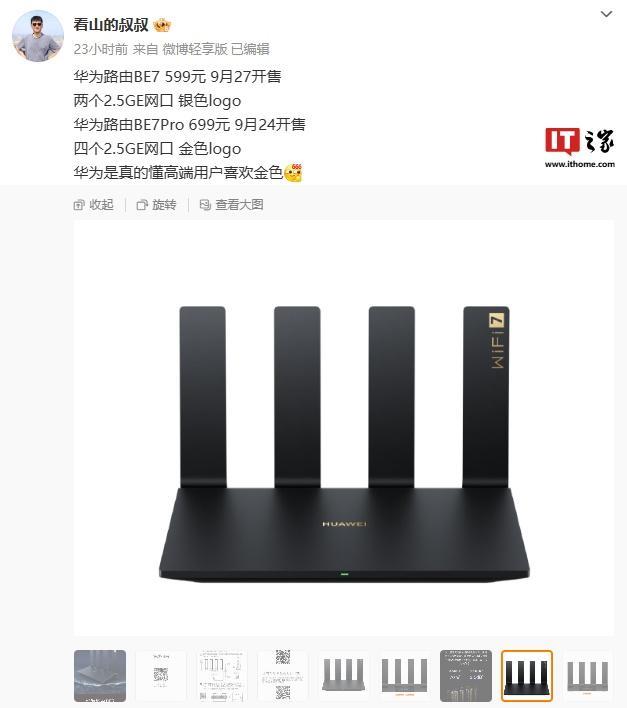 此外,华为路由 BE7 Pro 将于 9 月 24 日开售,配备 4 个 2.5GE 网口、使用金色 Logo,售价 699 元。