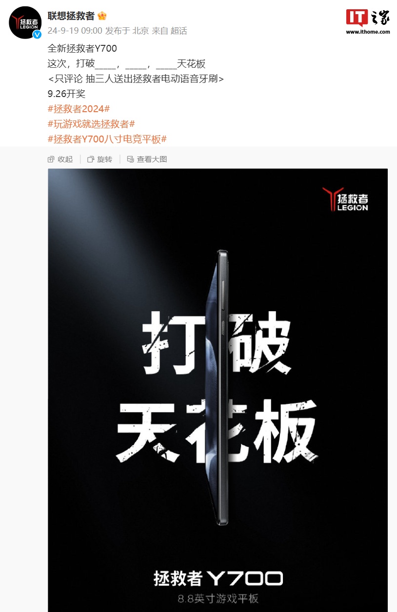 《联想拯救者暗示 9 月 29 日发布新一代 Y700 电竞平板》