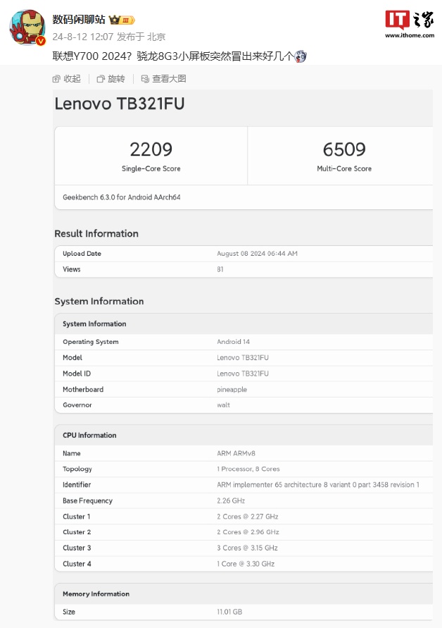 此外,型号为 TB321FU 的联想新机现身 GeekBench,该机单核得分 2209,多核得分 6509,CPU 信息与高通骁龙 8 Gen3 处理器相似。爆料称该机有望为联想拯救者 Y700 小屏平板,预装 ZUI 16.1 系统。