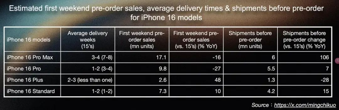 知名消费电子分析师郭明錤在上周末发布的分析显示,iPhone 16 Pro系列的两款手机预售情况明显弱于上一代。其中iPhone 16 Pro Max首个周末的预售数量预期为1710万部,比起iPhone 15 Pro Max同期少16%。反倒是iPhone 16和16 Plus因为显著的硬件提升(以苹果的标准而言),预定数据明显好于上一代。