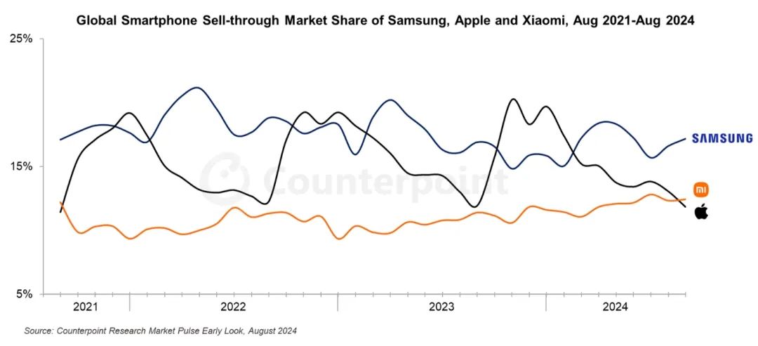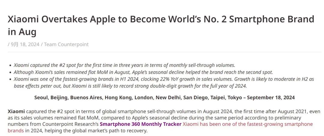 该机构表示,出现这一情况的背后有两大原因。首先是苹果iPhone历来会在9月新机发布前经历季节性销售淡季。与此同时,小米虽然在8月销售量环比持平,但中国品牌也是2024年上半年增速最快的品牌之一,销售量同比增速达到22%。即使下半年的增速因基数效应放缓,Counterpoint预期该品牌依然能获得“强两位数百分比”的全年增速。